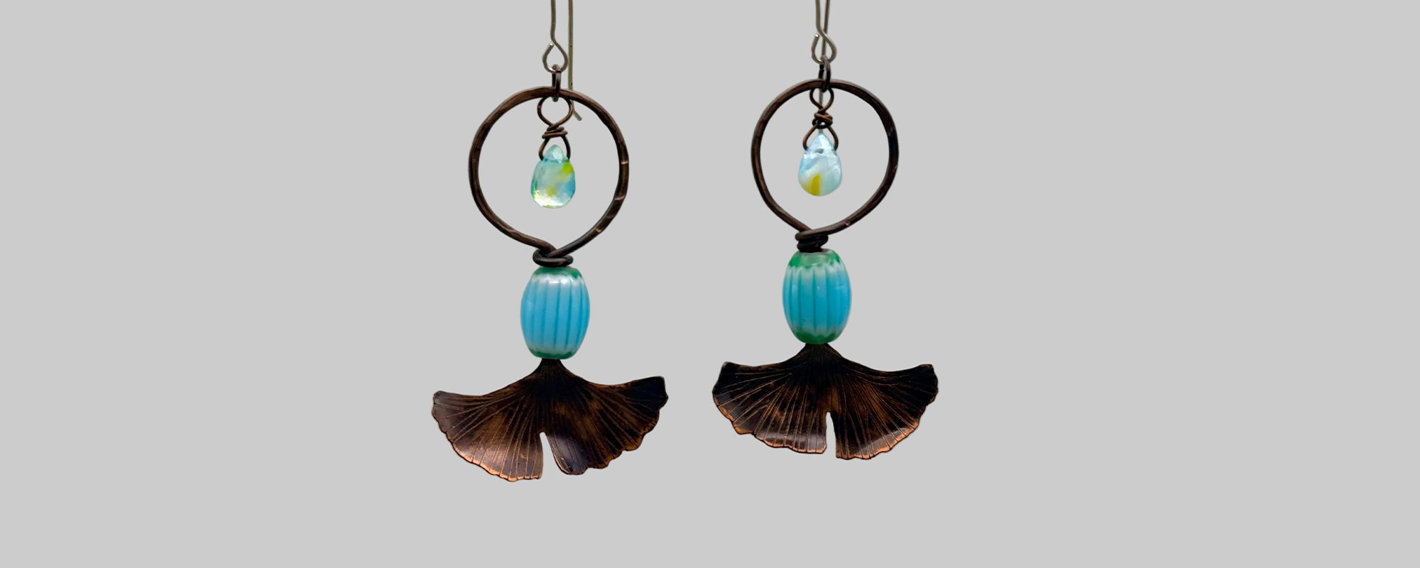 Resilience of the Ginkgo Hand Engraved Copper & Blue Green/Gold Glass Bead Earrings.