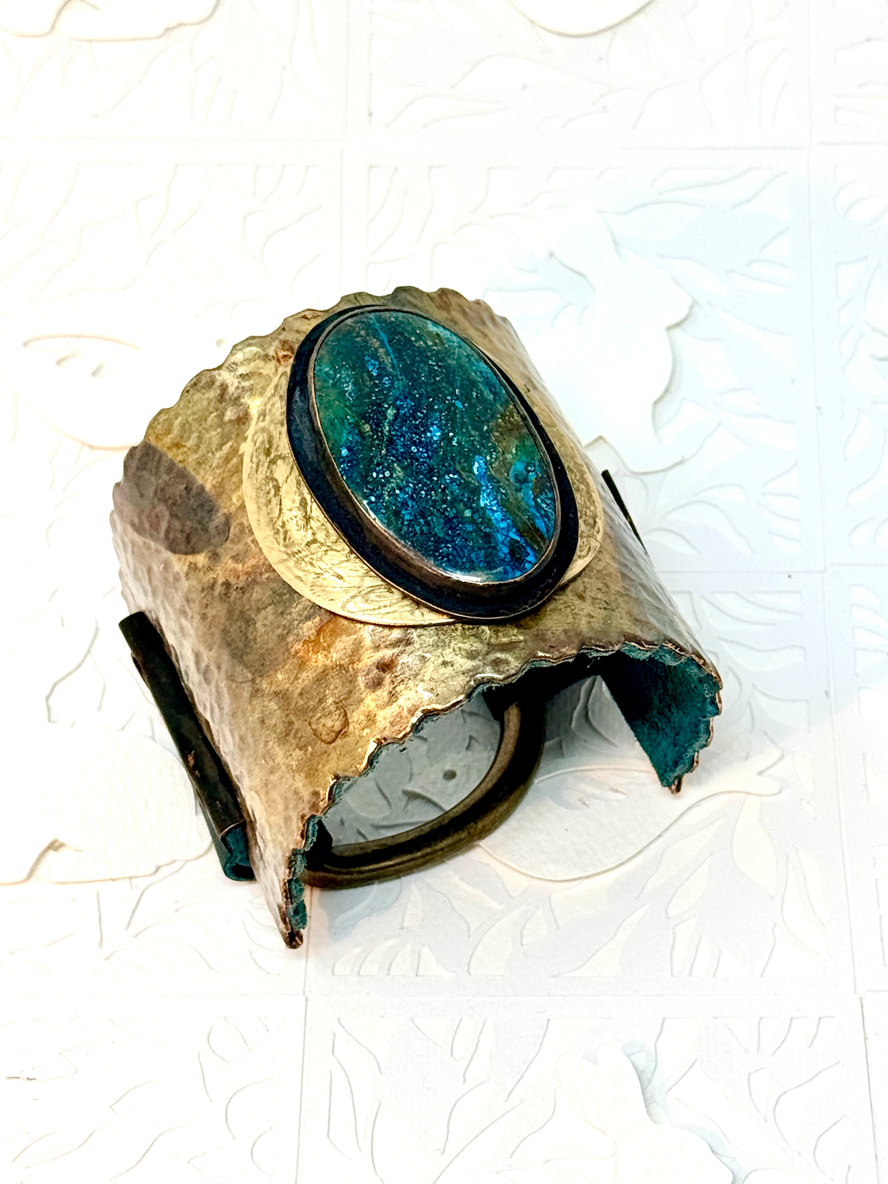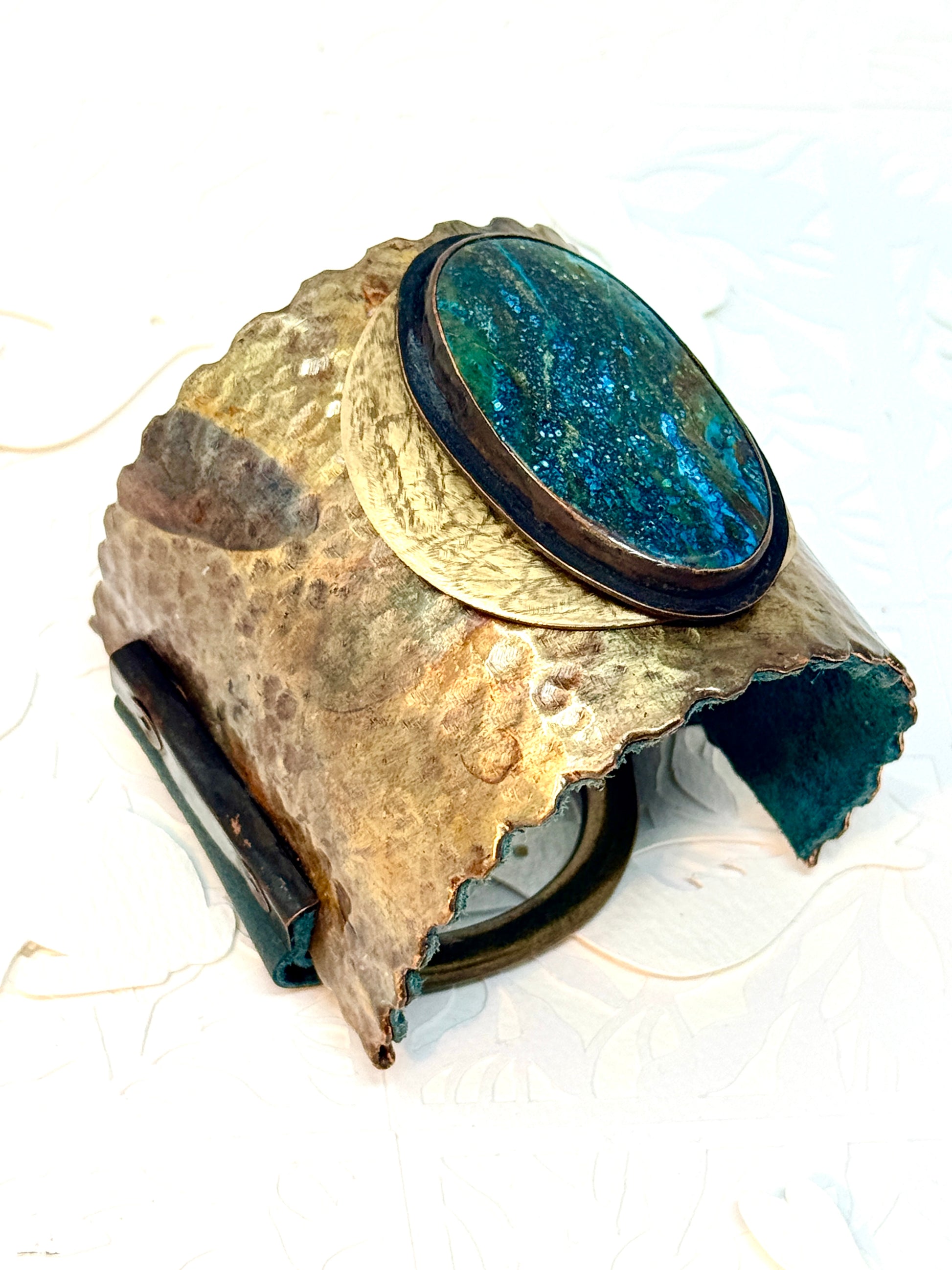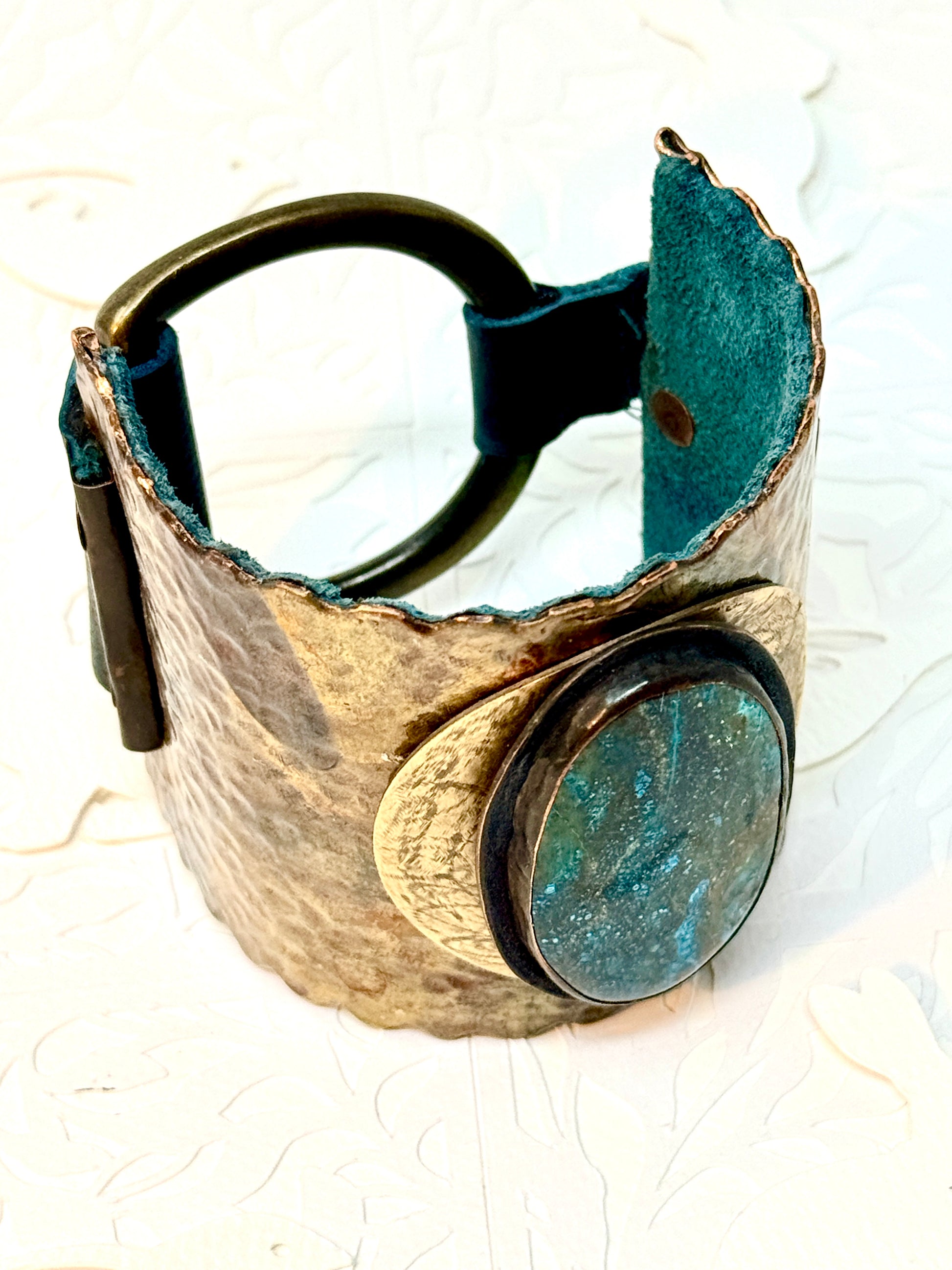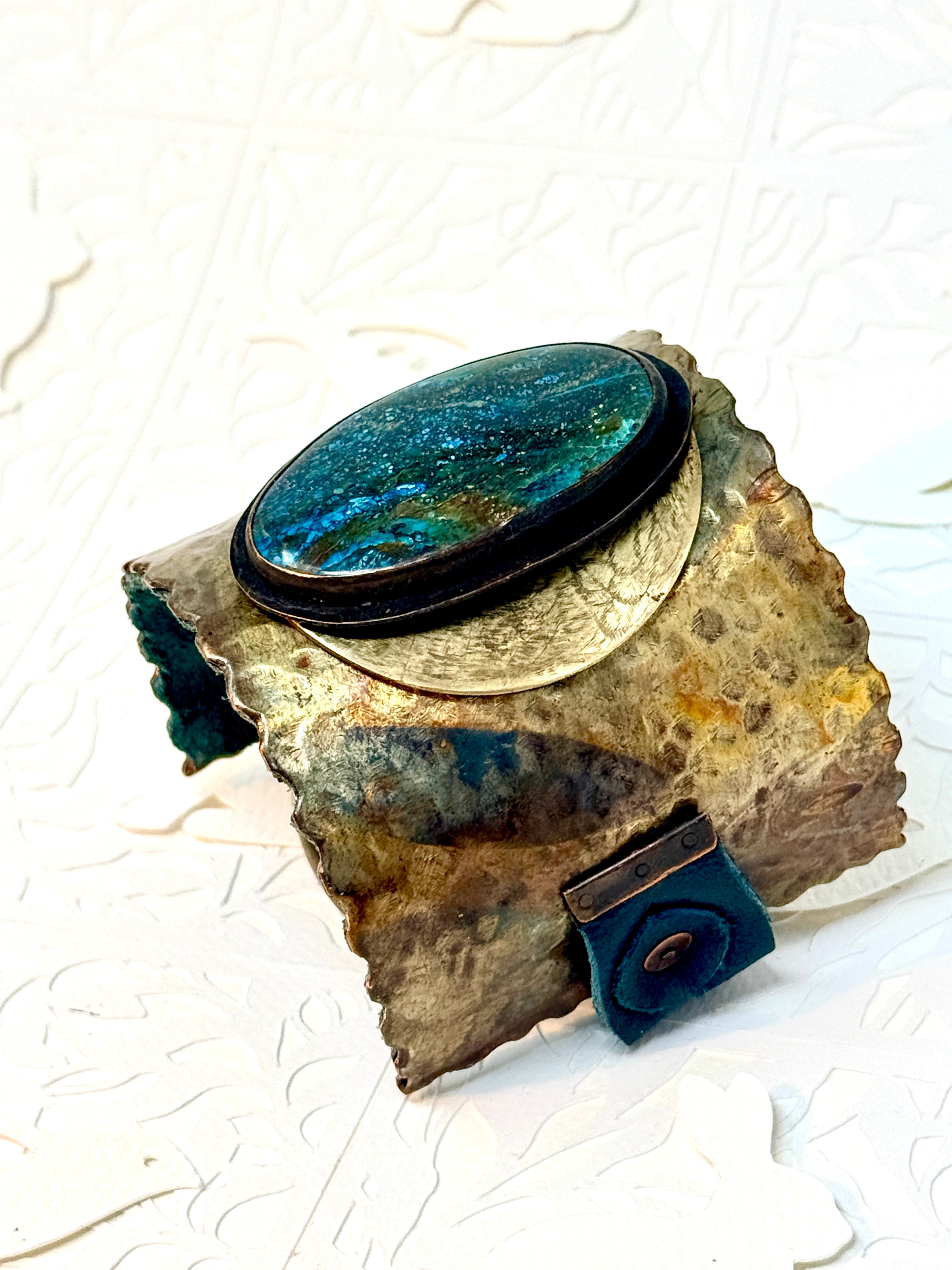 This cuff has layers of textures and feels weighty & solid, yet comfortable. The recycled hammered copper exhibits a colorful flame patina. The scalloped border feels playful. A soft, teal suede lines the interior for comfort. The heavy brass catch with leather closure balances the piece. The focal point combines a vintage brass medallion with an Azurite Chrysocolla cabochon in a copper bezel. A clear acrylic coating preserves the flame patina.