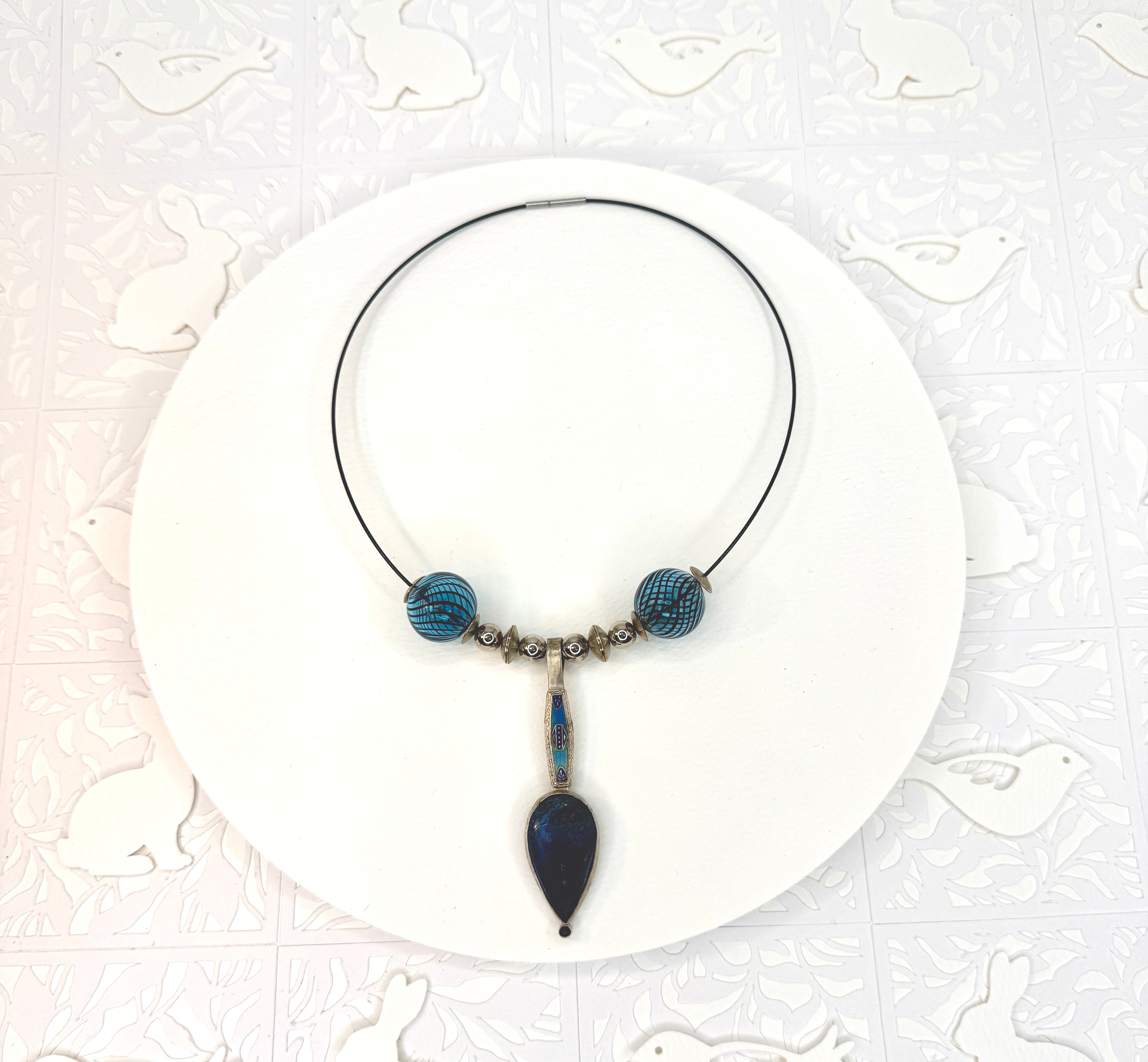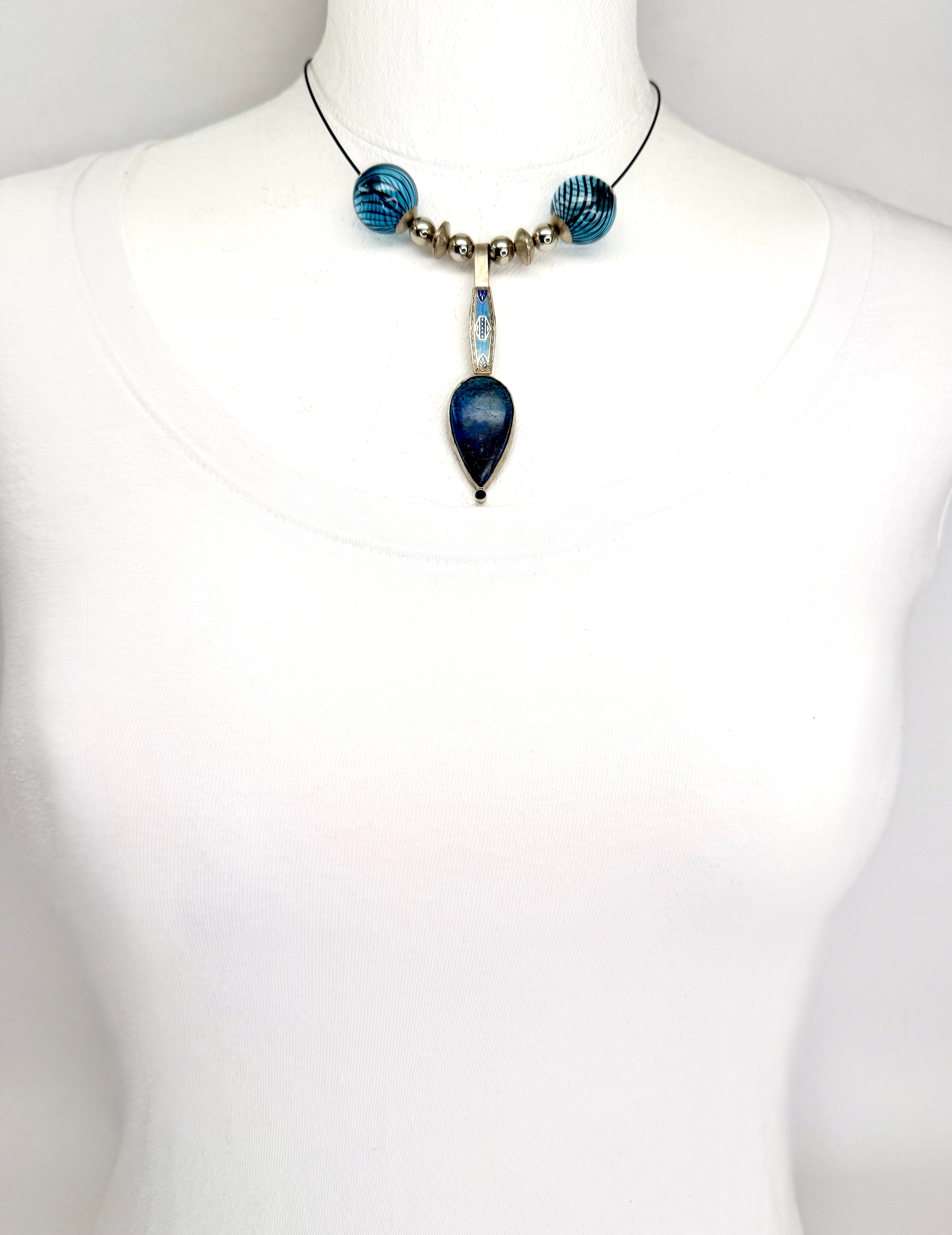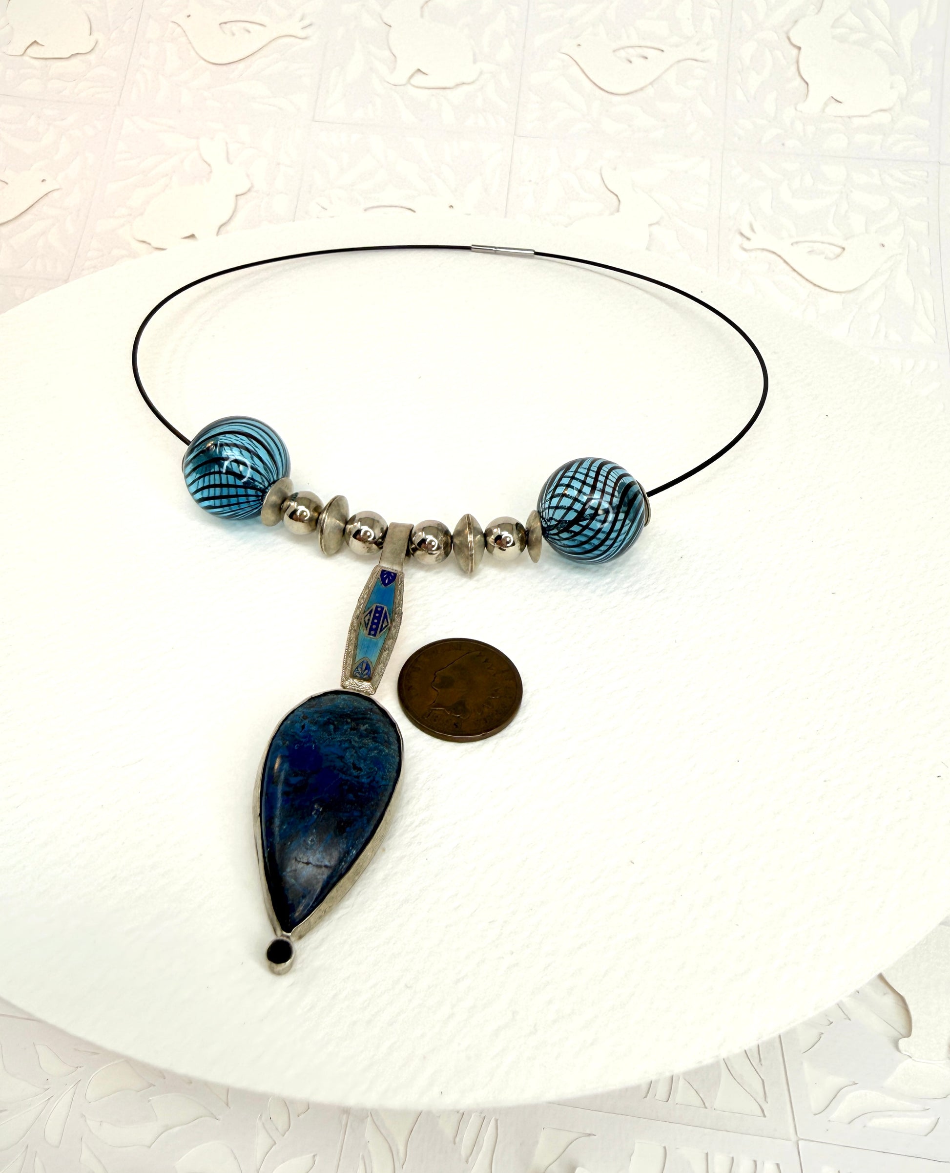 Yummy colors in this Blue Chrysocolla teardrop cabochon in a fine silver bezel perfectly highlight the blues in the vintage enameled medallion. The sterling silver backplate extends to capture a deep blue transparent stone in a tube setting. Hand-blown transparent blue-swirl glass beads capture deeper colors in the stone. Hand-crafted sterling disc beads completes the ensemble. A minimalist, black poly-coated steel cable choker ensures the pendant steals the show.